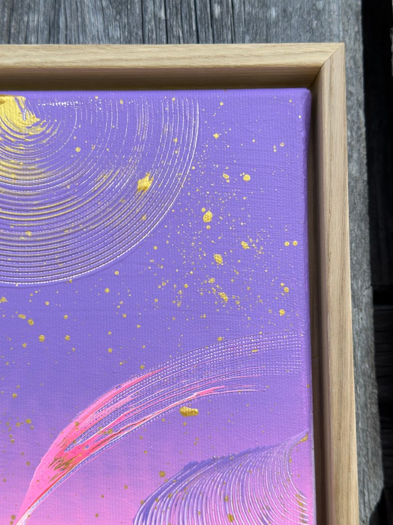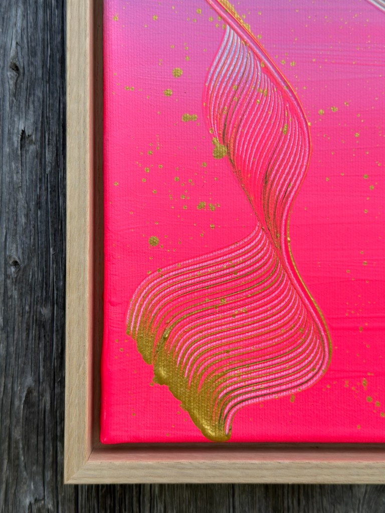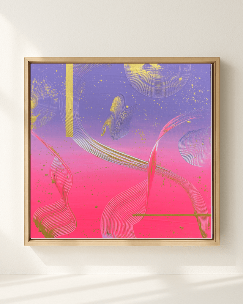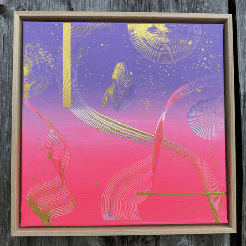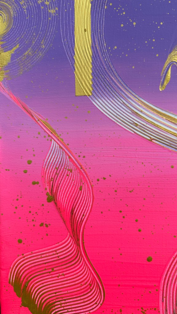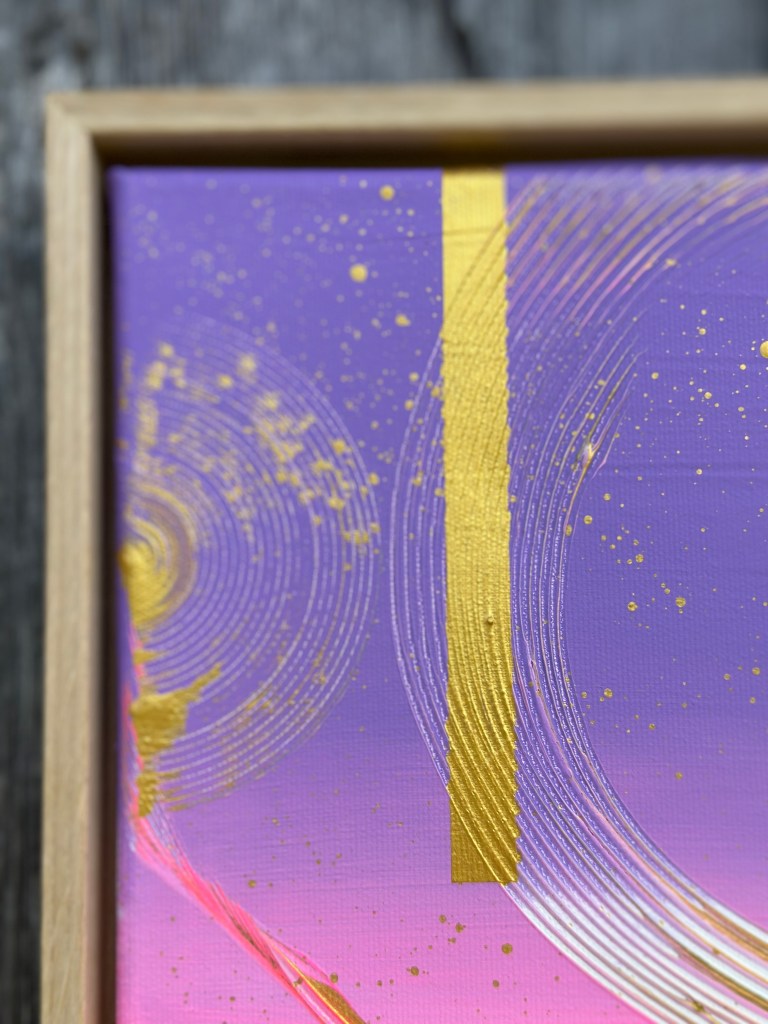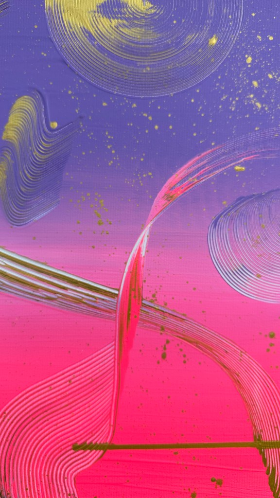 Alles im Universum bewegt sich in Wellen – stetig, verbunden, kraftvoll. “Cosmic Flow” spiegelt diese Dynamik wider: Farben verschmelzen, goldene Akzente leuchten wie Sterne, und feine Linien zeichnen die unsichtbaren Bahnen der Energie nach. Ein Werk, das Vertrauen in den natürlichen Rhythmus des Lebens schenkt.
